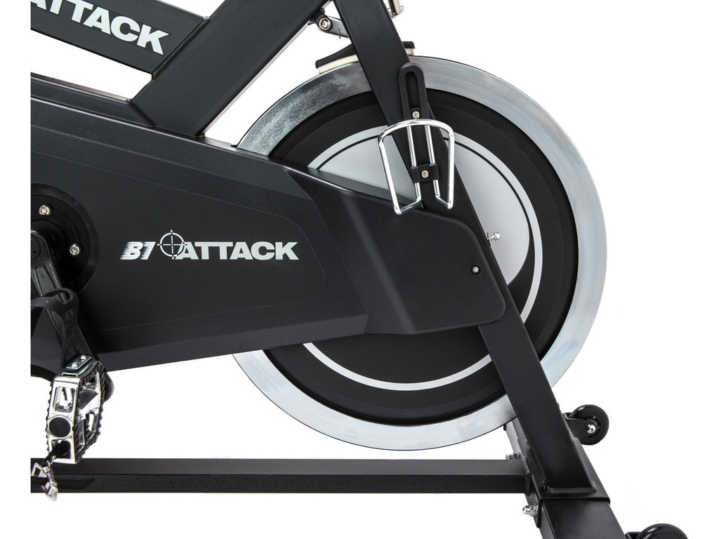 With a matte black frame, racing handlebars, and twin bottle holders, the Spin Attack B1 combines sleek design with practicality. The innovative resistance system offers a smooth, quiet ride, while the quick-release system and alloy construction on the handlebar stem and seat post provide maximum durability and stability.